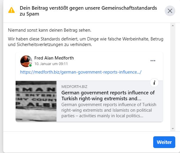 My post on the infiltration of the political parties in Germany by Turkish right-wing radicals and Islamists allegedly violates community standards. With this, Facebook is clearly taking sides with Islamists.